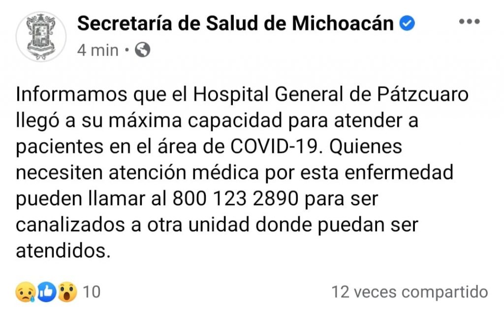 Morelia, Michoacán a 04 de agosto del 2021.- Esta tarde la Secretaria de Salud de Michoacán informó a la ciudadanía en general sobre la saturación en el Hospital General de Pátzcuaro con pacientes Covid-19.