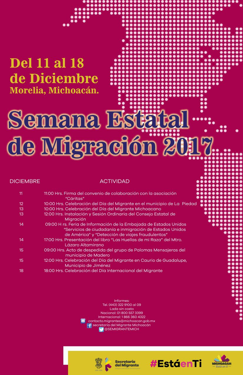 Morelia, Michoacán, a 11 de diciembre de 2017.- Hoy lunes 11 de diciembre inician las actividades de la Semana Estatal de Migración 2017, anunció hoy el titular de la Secretaría del Migrante (Semigrante), José Luis Gutiérrez Pérez.