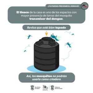 Para prevenir el dengue, se recomienda tomar medidas en el hogar, como lavar, tapar, voltear y desechar recipientes que acumulan agua, como llantas, cubetas, tinas, floreros y botellas en desuso. Estos objetos son sitios propicios para que el mosquito deposite sus huevecillos, que tienen un período de incubación de entre siete y diez días.