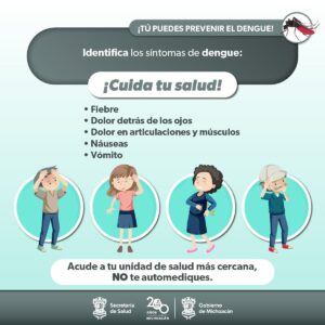 Morelia, Michoacán, 21 de abril de 2024.- La Secretaría de Salud de Michoacán (SSM) llama a la población a identificar a tiempo los signos del dengue, infección que es transmitida por el mosco Aedes Aegypti, que provoca fiebre, dolor en huesos, cabeza y articulaciones, así como malestar general.