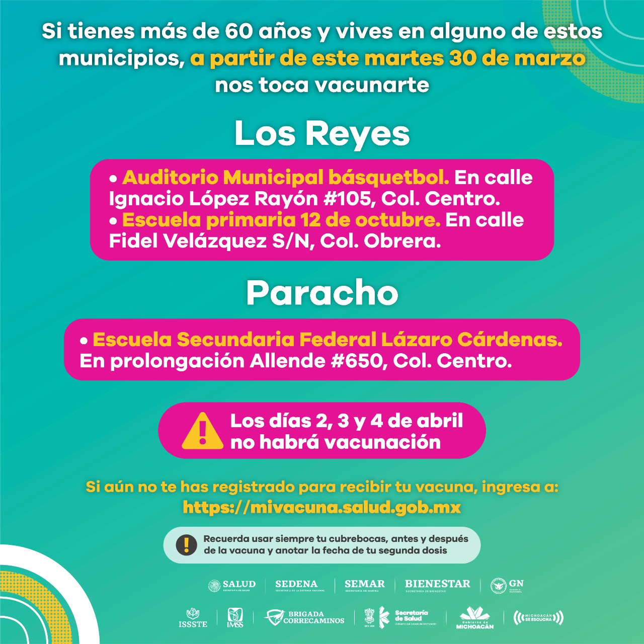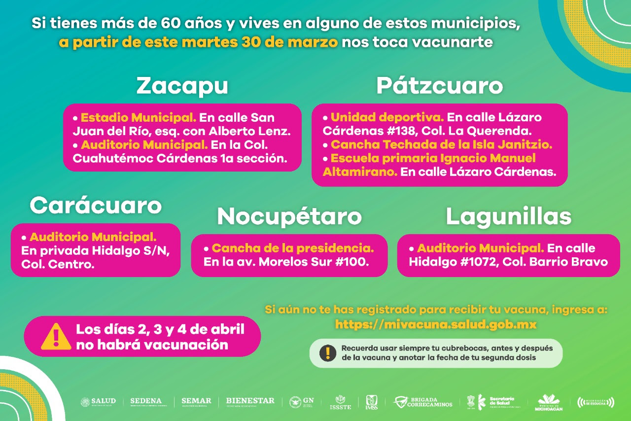 Personal de enfermería, médico y paramédico de la Secretaría de Salud de Michoacán (SSM), será desplegado en Zacapu, Pátzcuaro, Los Reyes, Paracho, Sahuayo, Cuitzeo, Charo, Álvaro Obregón, Juárez, Tuxpan, Jiquilpan, Tiquicheo, Queréndaro, Indaparapeo, Huandacareo, San Lucas, Copándaro, Susupuato, Carácuaro, Nocupétaro, Jungapeo, Lagunillas, Tzitzio, Ocampo, Chucándiro, Huaniqueo y Santa Ana Maya.