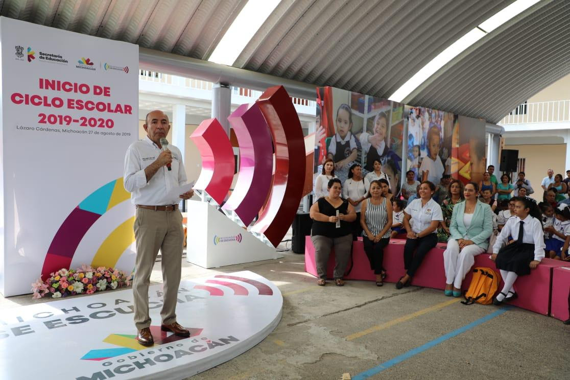 Lázaro Cárdenas, Michoacán a 28 de agosto de 2019.- Con el reconocimiento a más de 64 mil maestras y maestros que a partir de esta semana retornaron a las aulas de los más de 11 mil planteles de nivel básico que hay en el estado, para atender la educación de las niñas y niños de Michoacán, inició en el puerto de Lázaro Cárdenas el Ciclo Escolar 2019-2020.