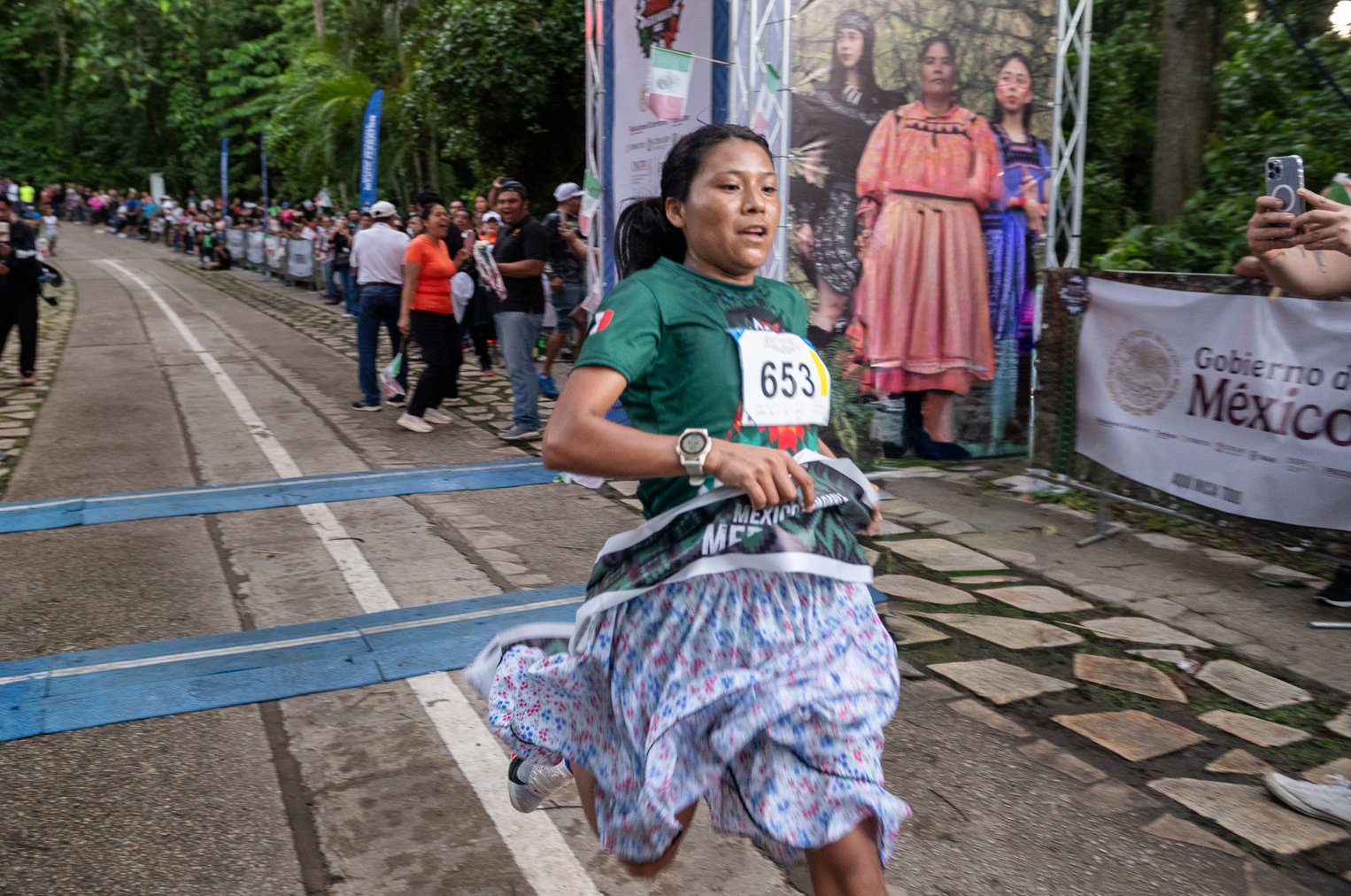 Juana Ramírez también se distingue por competir utilizando vestimenta tradicional rarámuri —huaraches y falda—, una forma de honrar la identidad y las tradiciones de su comunidad mientras participa en competencias de alto nivel.