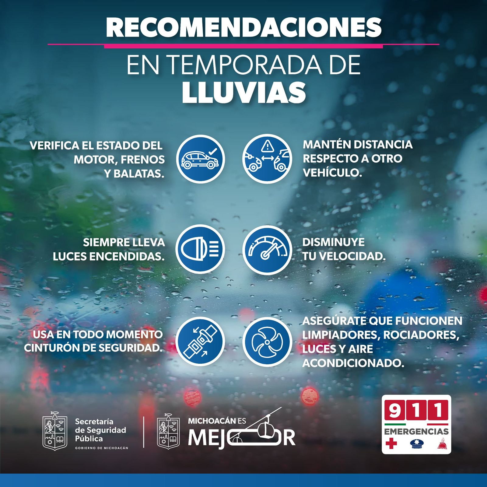 Morelia, Michoacán, 25 de junio del 2025.- En esta temporada de lluvias, la Secretaría de Seguridad Pública hace un exhorto a la población a seguir las recomendaciones y reglas de seguridad vial para prevenir accidentes de tránsito en Michoacán, y pone a disposición la línea de emergencias 911 para atender incidentes.