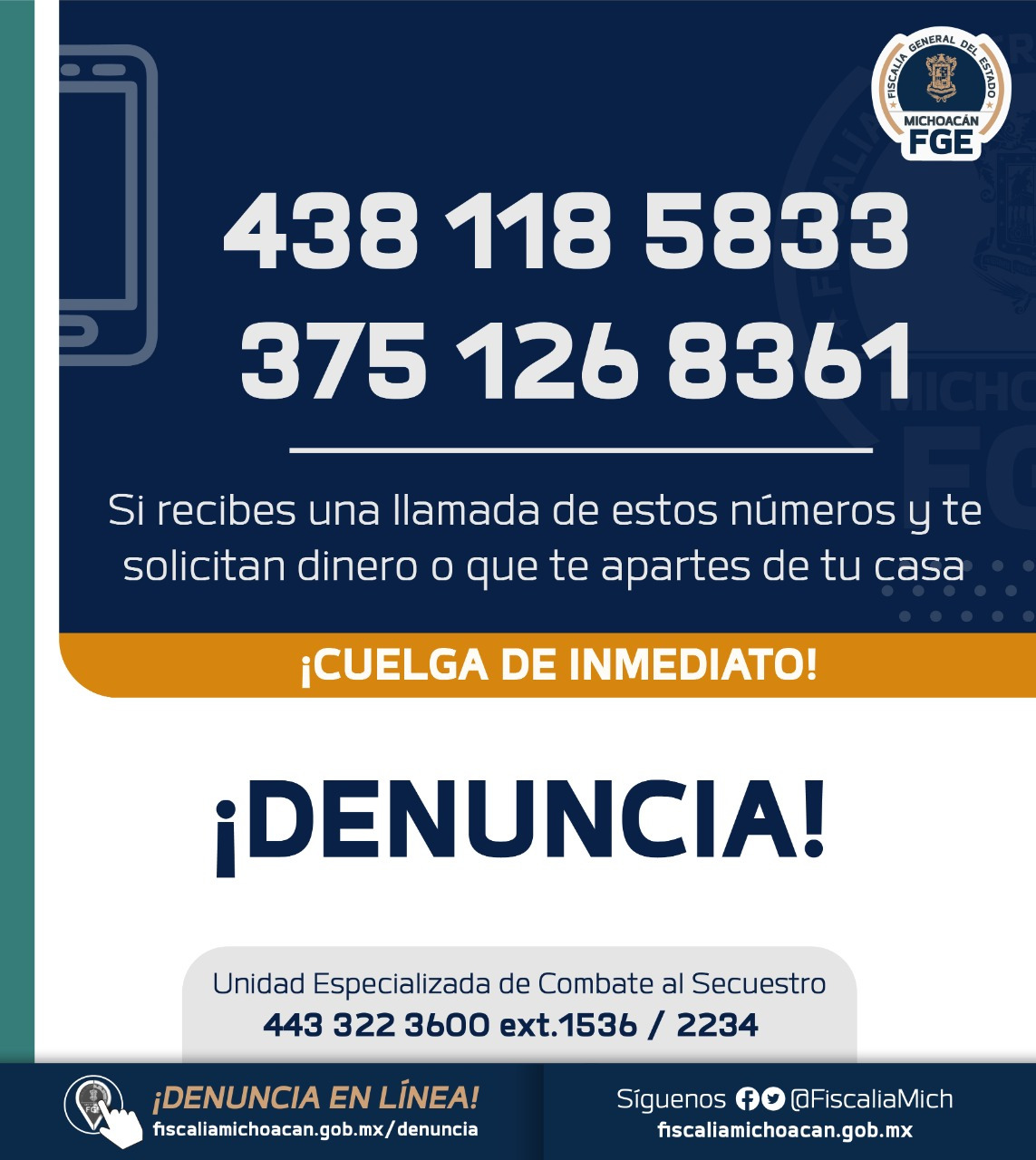 La FGE solicita a la población a no atender este tipo de llamadas y denunciarlas de forma inmediata ante la Fiscalía Regional más cercana, o bien, a la Unidad Especializada de Combate al Secuestro, ubicada en Periférico Independencia #5000, colonia Sentimientos de la Nación en Morelia, o comunicarse al teléfono 443 322 36 00 extensión 2234.