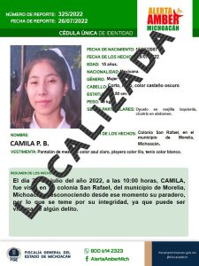 Morelia, Michoacán, a 28 de julio de 2022.- La Fiscalía General del Estado de Michoacán (FGE), localizó a salvo a C.P.B., de 15 años de edad, quien este día fue reportada como desaparecida en la capital michoacana.