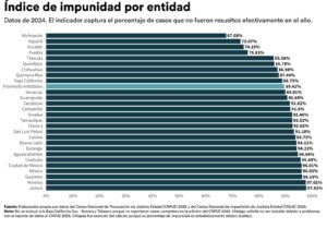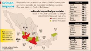 En contraste, el reporte señala niveles críticos de impunidad en otras entidades, como es el caso de Jalisco, con un 97.81 por ciento; Morelos, con un 97.61 por ciento; y Guerrero, con un 96.19 por ciento.