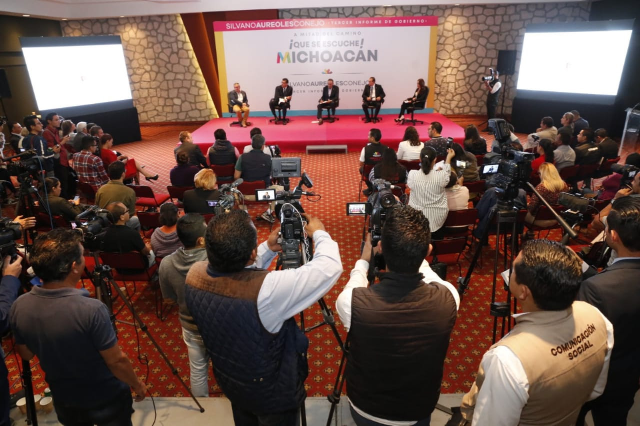 Morelia, Michoacán, a 27 de septiembre de 2018.- En el marco del Tercer Informe de Gobierno, y por instrucción del Gobernador Silvano Aureoles Conejo, se realizó el primer panel – rueda de prensa con el Gabinete de Gobernabilidad, un formato innovador, dinámico y participativo donde medios de comunicación locales y regionales, sociedad civil y autoridades, sostuvieron un diálogo directo sobre el ejercicio de gobierno en estos primeros tres años.