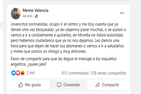«Jovencitos normalistas, ocupo ir al centro y me doy cuenta que ya tienen otra vez bloqueado, ya les dejamos pasar muchas, o se quitan o vamos a ir a cordialmente a quitarlos, en Morelia no habrá autoridad, pero habemos ciudadanos que ya no nos dejamos. Les damos una hora para que dejen de hacer sus desmanes o vamos a ir a saludarlos y miren que somos un chingo y muy entrones. Favor de compartir para que les llegue el mensaje a los inquietos angelitos, ¿Quién jala?», posteó en su perfil de facebook.