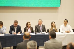 Participaron en la mesa el director general de Apoyo Técnico, Eugenio Govea Arcos; el titular de la Unidad de Prospectiva, Planeación y Evaluación de la Secretaría de Economía, Carlos Candelaria López y la presidenta municipal de Uruapan, Grecia Itzel Quiroz García.