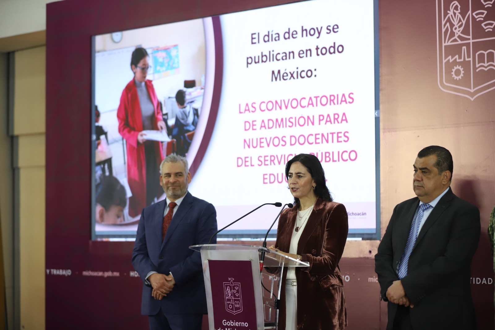Morelia, Michoacán, 29 de enero de 2024.- Este lunes se publican a nivel nacional las convocatorias de admisión para nuevos docentes del servicio público educativo, y en próximas horas se dará a conocer la correspondiente a Michoacán que prevé pueda sumar a alrededor de mil docentes a las aulas michoacanas, informaron el gobernador Alfredo Ramírez Bedolla y la secretaria Gabriela Molina Aguilar.