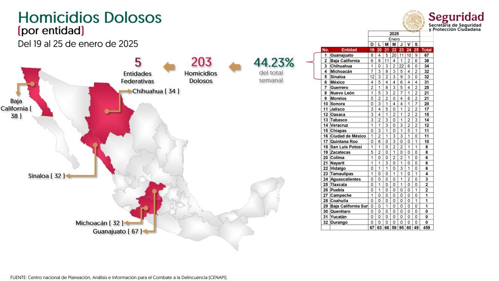 Según datos de la Secretaría de Seguridad y Protección Ciudadana (SSPC), entre el 19 y el 25 de enero, se registraron 459 homicidios dolosos en todo México, de los cuales 32 ocurrieron en Michoacán.