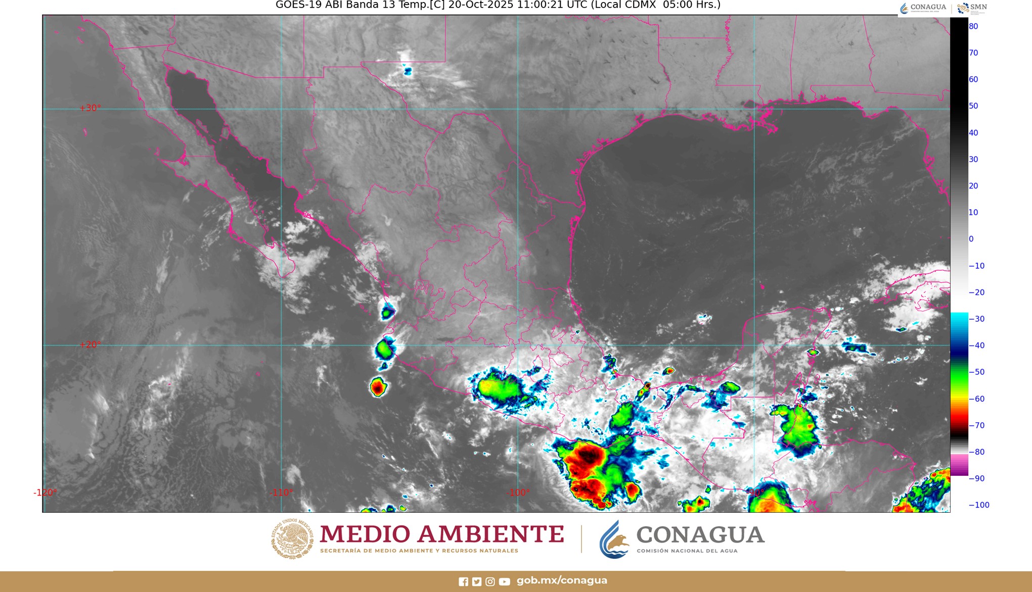 Un canal de baja presión que prevalece en el interior del país, junto con el ingreso de aire húmedo del océano Pacífico y el golfo de México, así como condiciones de inestabilidad atmosférica en el occidente del territorio nacional, generarán lluvias fuertes en Guerrero y chubascos en Michoacán, Colima, Jalisco, Nayarit, Sinaloa y Durango.
