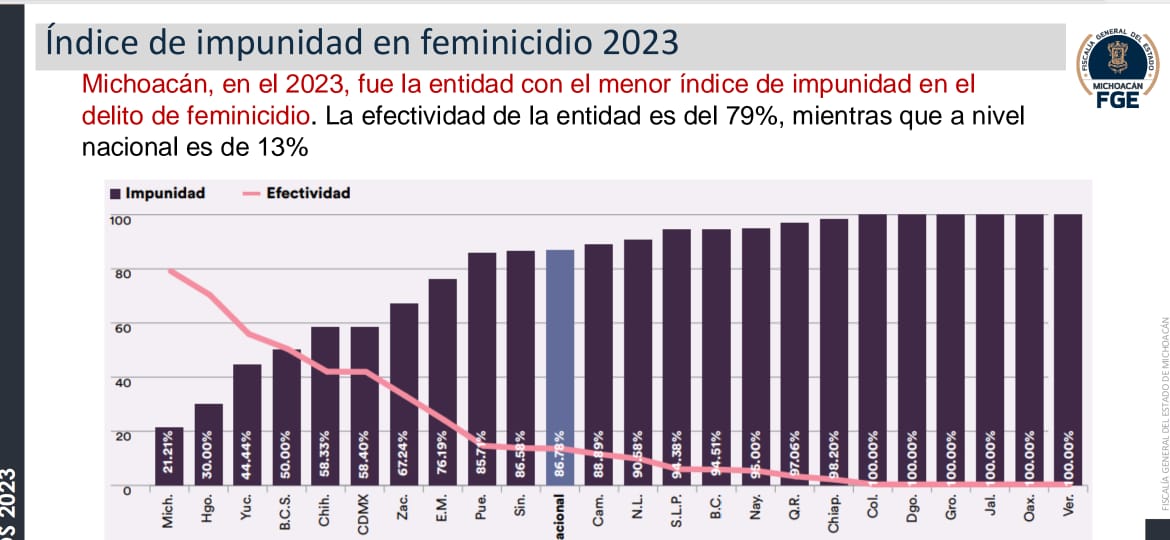Morelia, Michoacán, 15 de noviembre de 2024.- El estado de Michoacán se colocó en la primera posición nacional del indicador de efectividad en procesos de justicia del delito de feminicidio en la evaluación publicada en la última edición del estudio Hallazgos 2023.