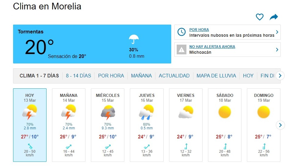 Morelia, Michoacán a 13 de marzo 2023.- De acuerdo con información del Servicio Meteorológico Nacional (SMN), en la ciudad de Morelia se  experimentará un clima variado en los próximos tres días. Se espera que las temperaturas oscilen entre los 12 y 27 grados Celsius, con una posibilidad de lluvia en algunos días.