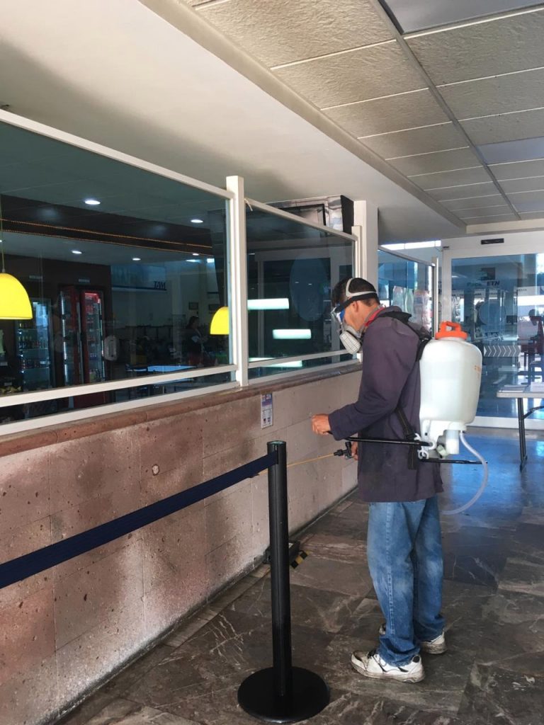 Asimismo, 2 veces al día, se implementa un esquema de limpieza y sanitización de instalaciones y unidades, rociando solución desinfectante en las áreas de mayor contacto común; diariamente se intervienen –en promedio— 90 autobuses.