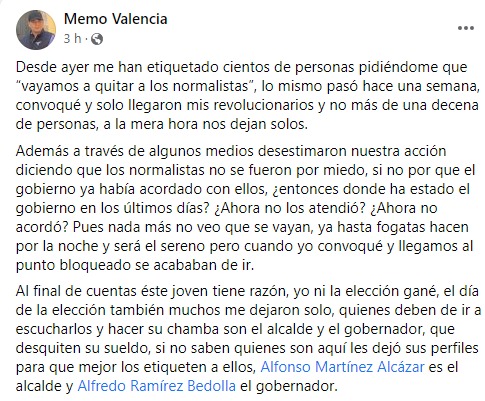 Sin embargo, en esta ocasión Memo Valencia afirmó que no tuvo el respaldo suficiente de los ciudadanos y que son las autoridades municipales y estatales quienes deben solucionar el conflicto social.
