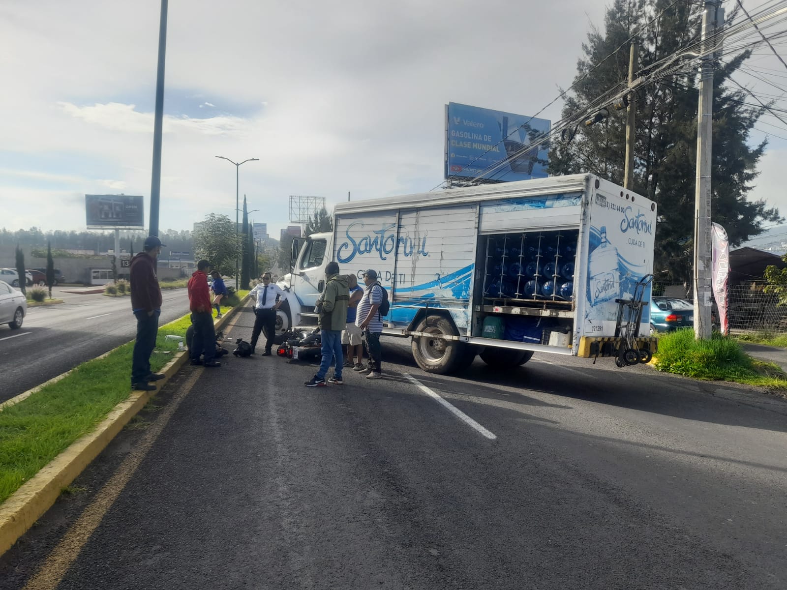 MORELIA MICH., 1 de agosto del 2022.- Joven motociclista resultó lesionado la mañana de este lunes al chocar contra un camión repartidor de una empresa de agua purificada.