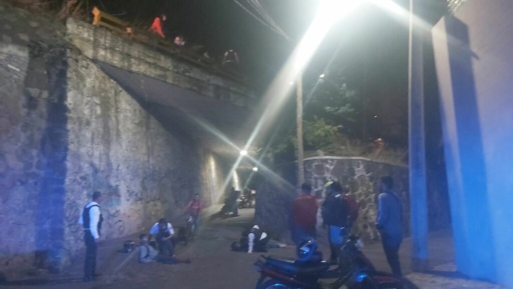 Morelia, Michoacán a 8 de noviembre 2022.- Dos jóvenes motociclistas sufrieron un accidente sobre el libramiento y cayeron de un puente, a unos metros del acceso a Casa Michoacán.