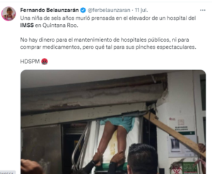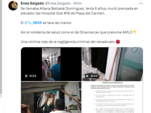 A 11 de julio del 2023.-Betzabé Domínguez una niña de 6 años de edad falleció este martes por la madrugada, en un elevador del Instituto Mexicano del Seguro Social (IMSS) en el que recibía tratamiento.