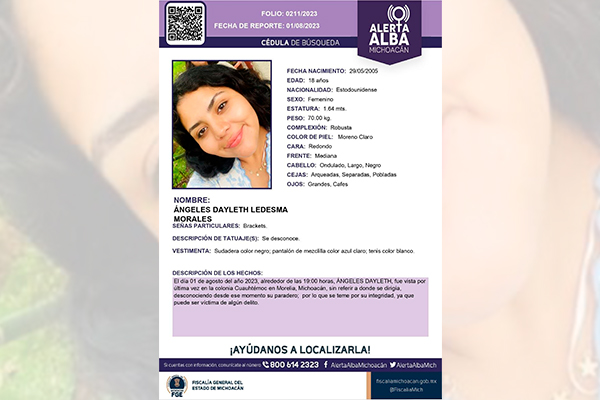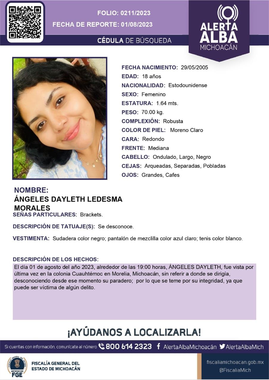 Se trata de Ángeles Dayleth Ledesma Morales, quien fue vista por última vez en las inmediaciones del bosque Cuauhtémoc ubicado en la colonia del Centro Histórico de Morelia donde ya es buscada.