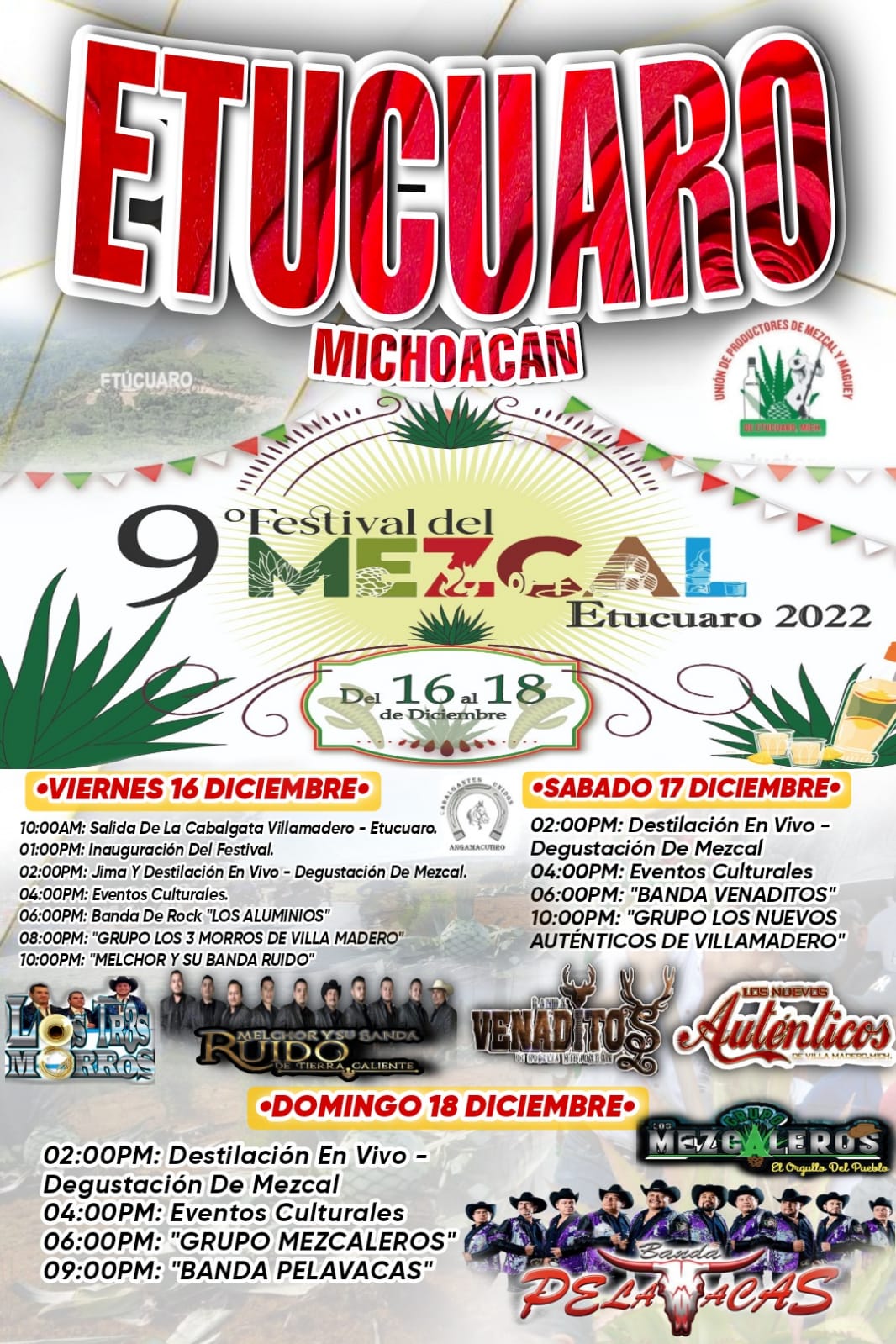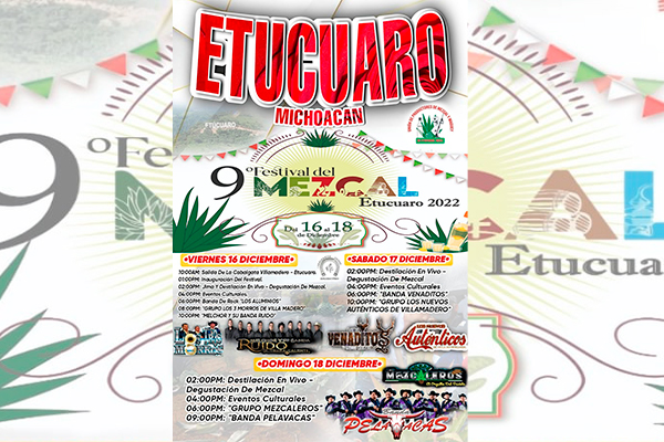 A 07 de diciembre del 2022.- Este 16 al 18 de diciembre no te puedes perder el 9° festival del mezcal en casa: San Francisco Etúcuaro, donde los mezcaleros de Etúcuaro te invitan a disfrutar de días llenos de diversión y sabor.