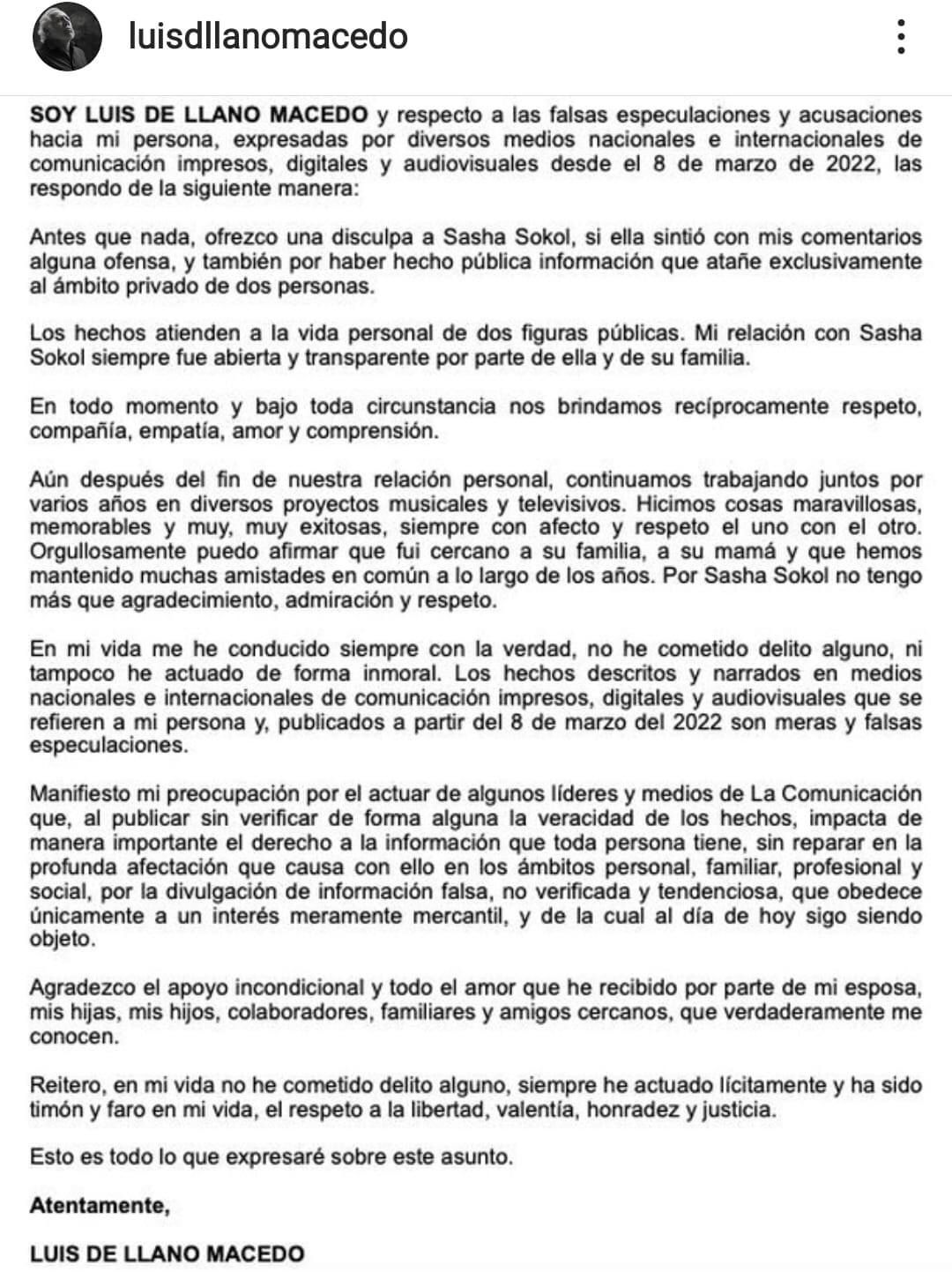 A 06 de Abril del 2022.- Tras la polémica que el pasado 8 de marzo donde Sasha Sokol anuncio en su redes sociales señalando a Luis de Llano de abuso, esto hasta la fecha ha dado de que hablar y personas del espectáculo como seguidores han demostrado su apoyo a Sasha.