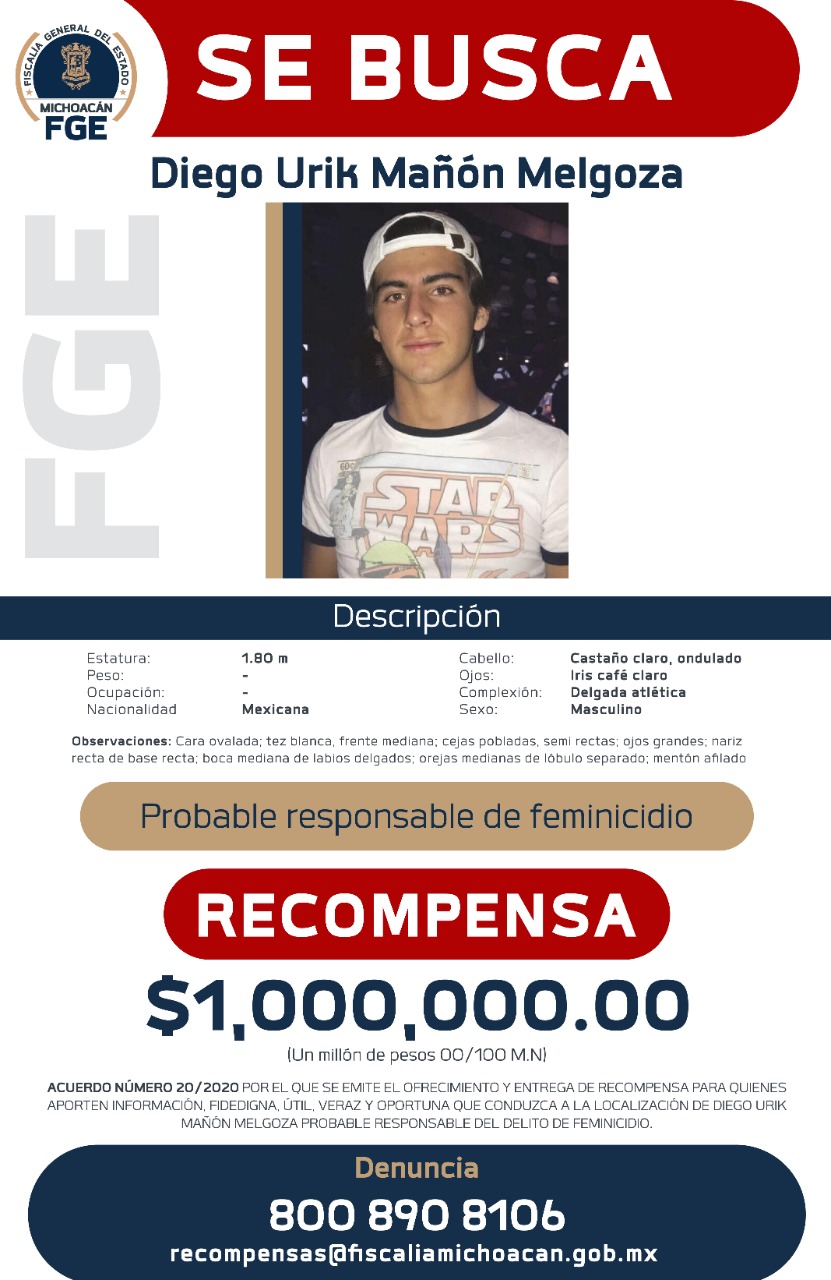 Morelia, Michoacán, a 28 de septiembre de 2020.- La Fiscalía General del Estado de Michoacán (FGE) expidió este día el Acuerdo por el que se emite el Ofrecimiento y Entrega de Recompensa para quienes aporten información fidedigna, útil y oportuna que conduzca a la localización de Diego Urik Mañón Melgoza, probable responsable del delito de feminicidio.