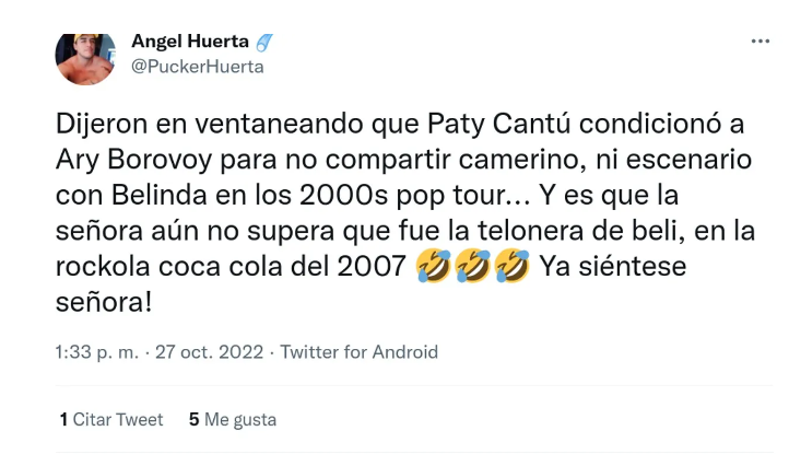 “Dijeron en Ventaneando que Paty Cantú condicionó a Ary Borovoy para no compartir camerino, ni escenario con Belinda en los 2000s pop tour”, escribió un usuario.