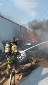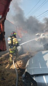 Morelia, Michoacán, 7 de mayo de 2025.- La Coordinación Estatal de Protección Civil, atiende un incendio registrado en el establecimiento denominado “Grúas Profesionales”, ubicado en el municipio de Tarímbaro.