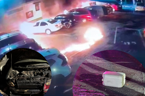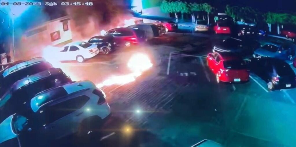 Gracias a los videos de las cámaras, se pudo observar que dos sujetos encapuchados llegaron al lugar con un garrafón lleno de gasolina, el cual rociaron sobre varios vehículos estacionados, les prendieron fuego y después huyeron.