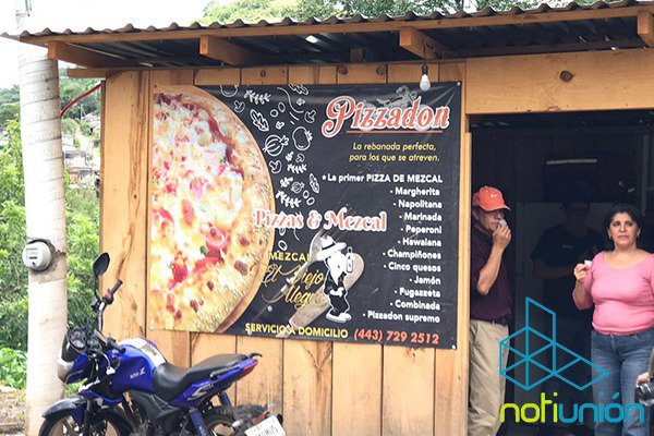 A unos pasos del letrero de bienvenida del municipio se encuentra ubicado el establecimiento donde preparan y hornean tu pizza. Con orillas rellenas de queso y mezcal como ingrediente principal, es como puedes ordenar y elegir tus ingredientes, además de acompañarla de una salsa habanera de mezcal.