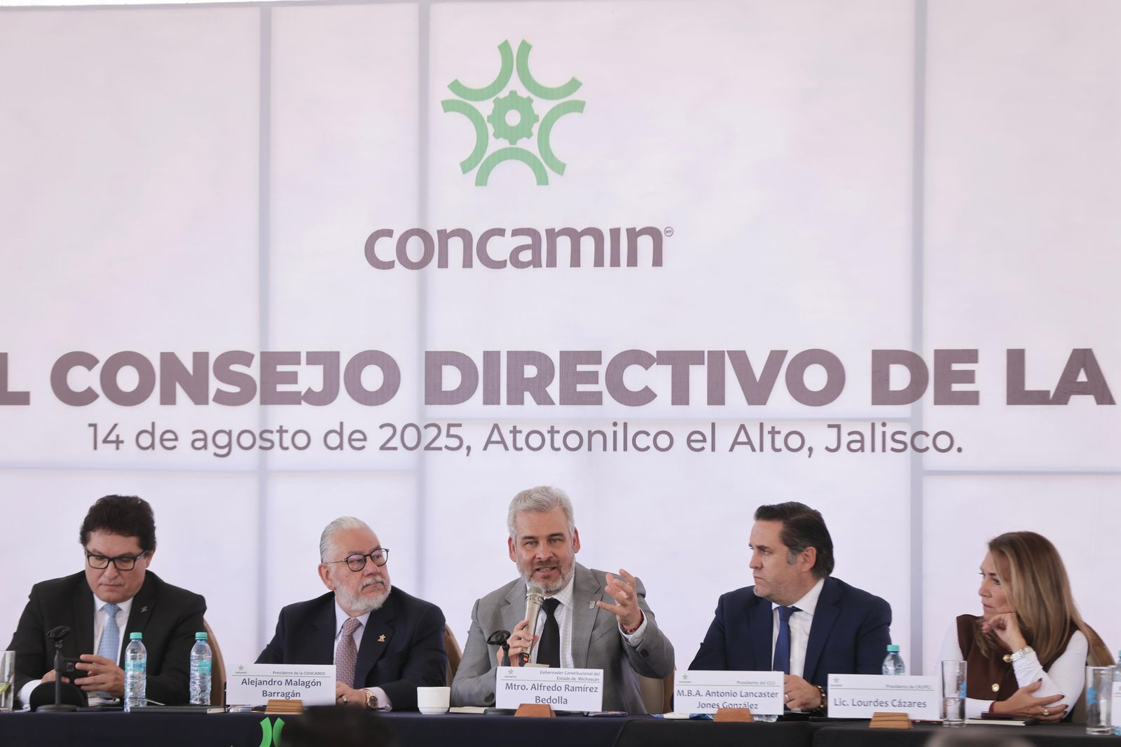 Atotonilco, Jalisco, 14 de agosto de 2025.- El gobernador Alfredo Ramírez Bedolla presentó a integrantes de la Confederación de Cámaras de Industriales de los Estados Unidos Mexicanos (Concamin), beneficios y ventajas competitivas para la inversión en el Polo de Desarrollo para el Bienestar Parque Bajío.