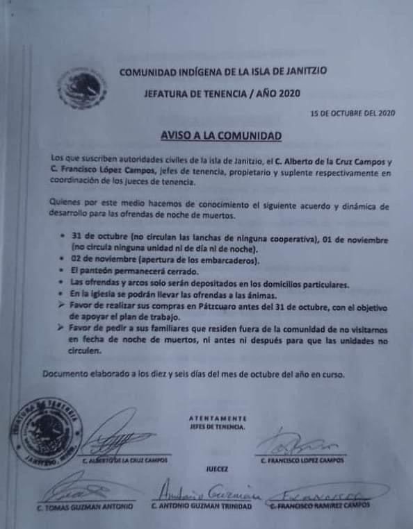 “No habrá acceso a NINGUNA isla del lago de Pátzcuaro, las cuales son Janitzio, Tecuena, Yunuen y Pacanda los días 31 de octubre y 1 de noviembre, ni de noche ni de día”