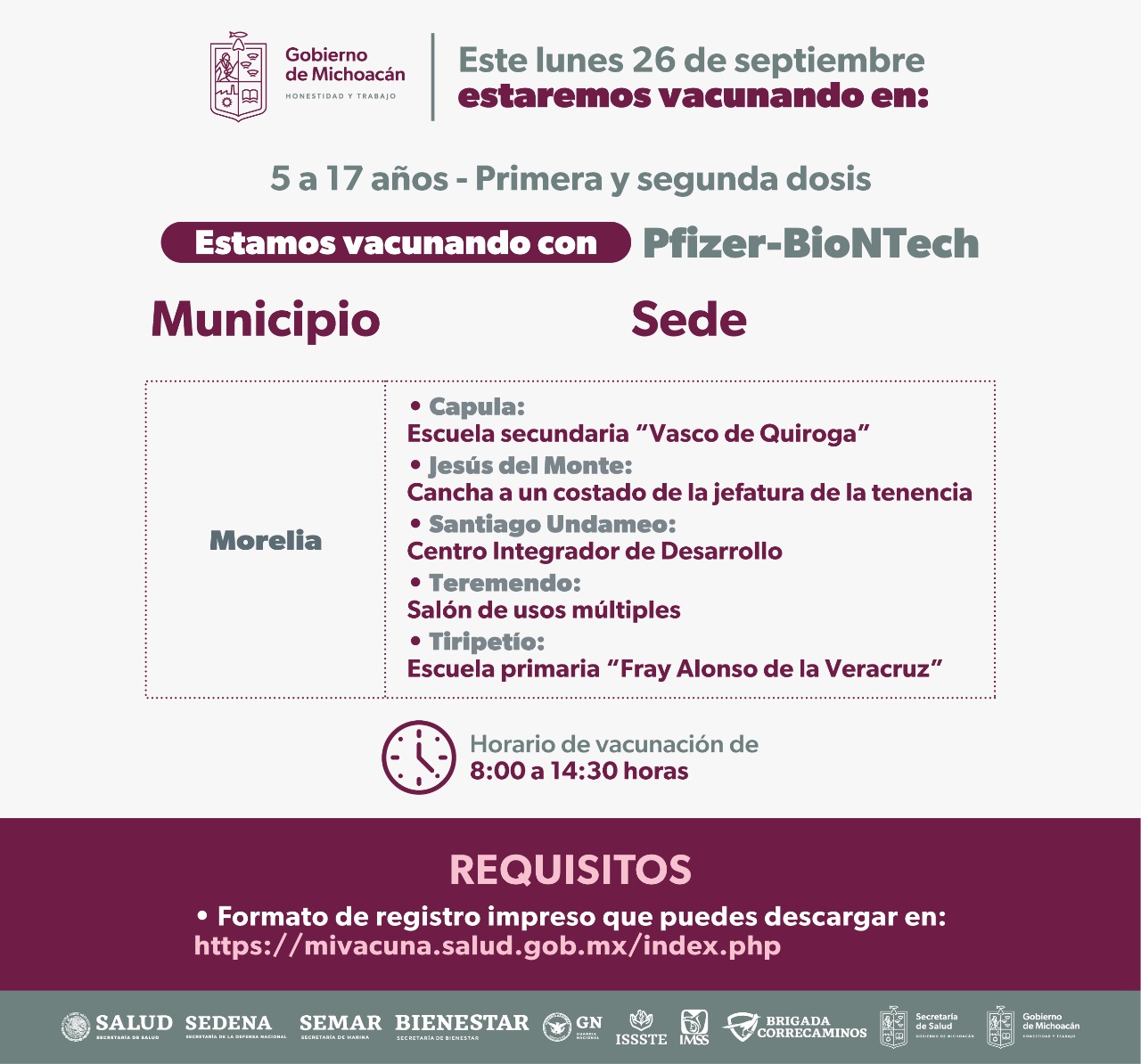 Morelia, Michoacán, 23 de septiembre del 2022.- Para dar cumplimiento al Plan Nacional de Salud, el próximo lunes 26 de septiembre serán vacunados, contra el COVID-19, todos los niños de 5 a 17 años de edad, en cinco tenencias de Morelia.