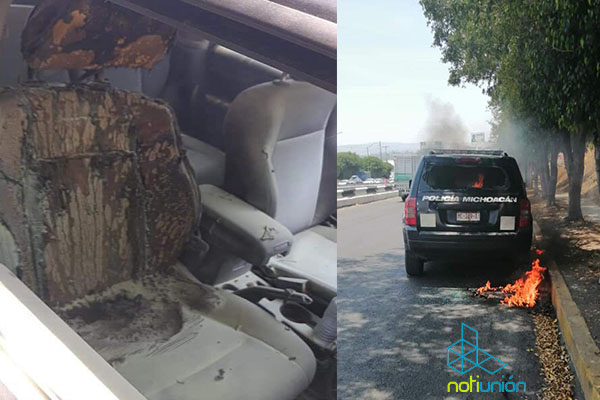 Morelia, Michoacán a 28 de mayo del 2021.- La tarde de este viernes unidades de la Policía Michoacán fueron atacadas por sujetos que lanzaron bombas molotov al interior de las patrullas con la finalidad de que ardieran en llamas.