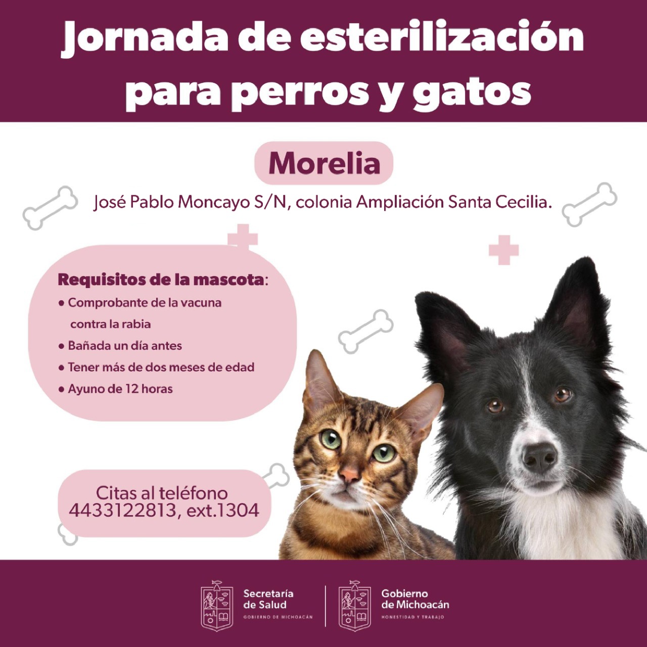 Morelia, Michoacán, 25 de octubre del 2022.- En el marco del mes nacional de la esterilización, la Secretaría de Salud de Michoacán (SSM), a través del departamento de Vectores y Zoonosis, realizará una jornada de esterilización canina y felina gratuita, en el centro de salud Santa Cecilia de Morelia.