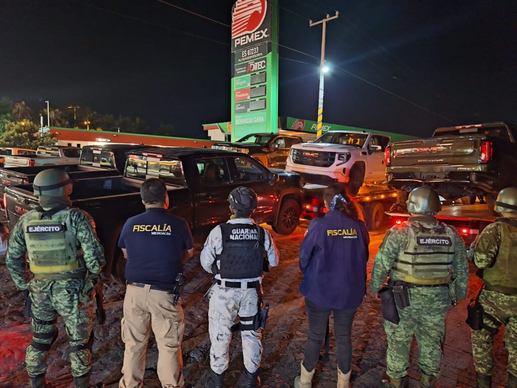Morelia, Michoacán, a 5 de julio de 2023.-Derivado de una acción operativa interinstitucional, la Fiscalía General del Estado de Michoacán (FGE) en coordinación con Guardia Nacional y Secretaria de la Defensa Nacional (SEDENA), aseguró siete camionetas de reciente modelo, que fueron reportadas como robadas con violencia el pasado 3 de julio en la carretera Morelia-Salamanca.