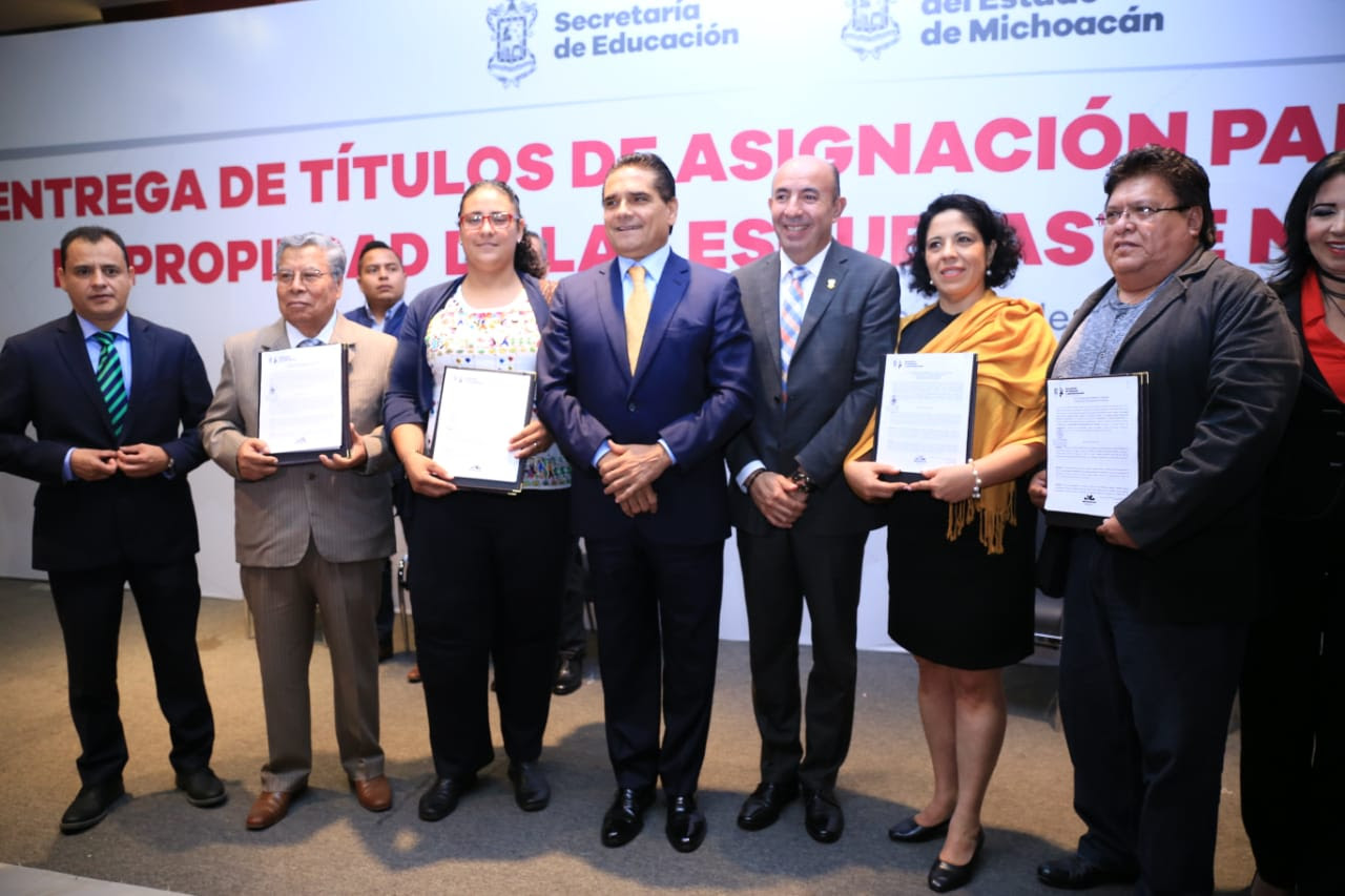 | Michoacán, a 19 de junio de 2018.- El Gobernador Constitucional Silvano Aureoles Conejo atestiguó la entrega de 43 títulos de asignación para acreditar la propiedad a escuelas de nivel básico, con lo que cual se da certidumbre al patrimonio educativo de 8 mil 600 alumnas y alumnos, además de personal docente y directivo.