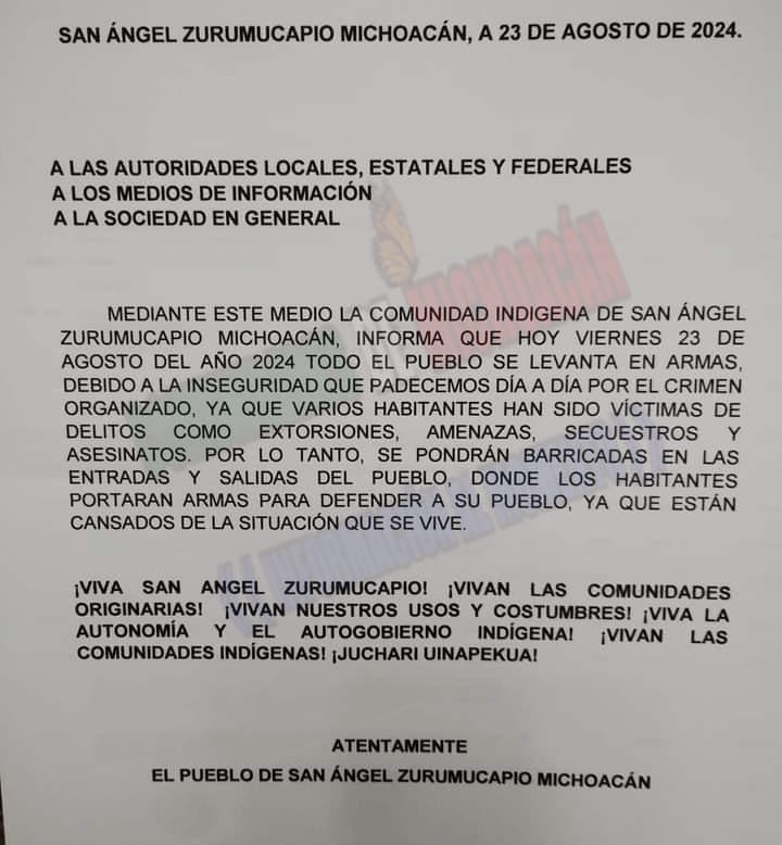 En un comunicado difundido por la comunidad, se declaró: “Hoy viernes 23 de agosto del año 2024, todo el pueblo se levanta en armas debido a la inseguridad que padecemos día a día por el crimen organizado”. La comunidad denunció que varios de sus miembros han sido víctimas de delitos graves, como extorsiones, amenazas, secuestros y asesinatos, perpetrados por grupos delictivos.