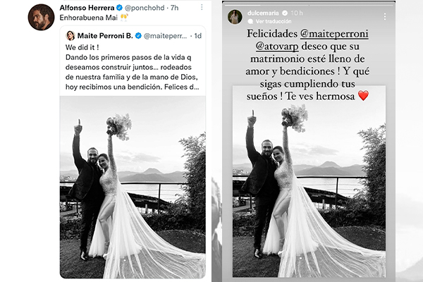 Los que si no se les vio para nada en la boda fue a sus compañeros Poncho y Dulce María pero no dudaron en mandarle un mensaje en redes sociales para felicitarla.