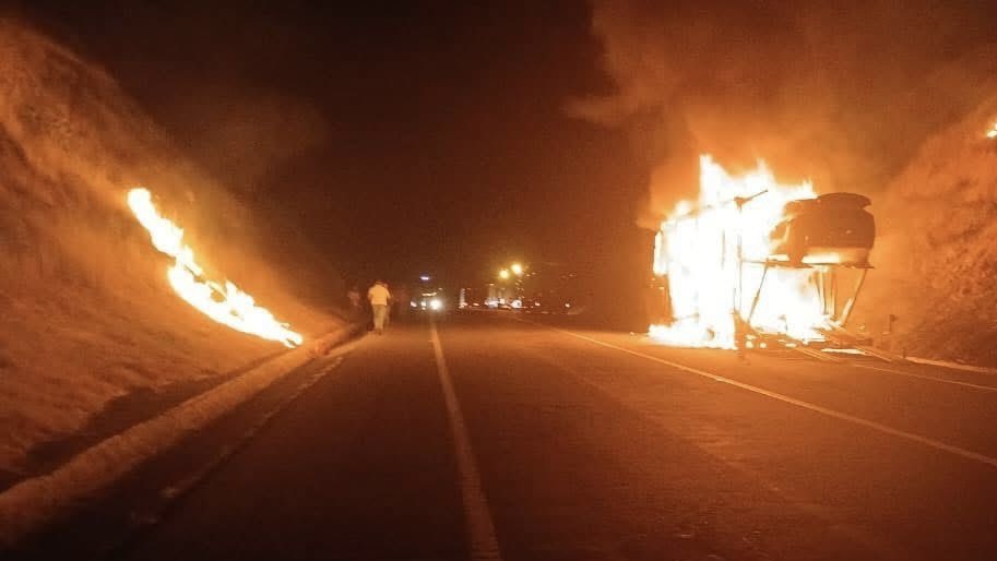La Huacana, Michoacán, 18 de diciembre de 2025.— Un camión nodriza se incendió la mañana de este jueves en la autopista Morelia–Lázaro Cárdenas (Siglo XXI), a la altura del municipio de La Huacana, dejando como saldo cinco vehículos nuevos totalmente calcinados, así como la pérdida total de la unidad de carga.