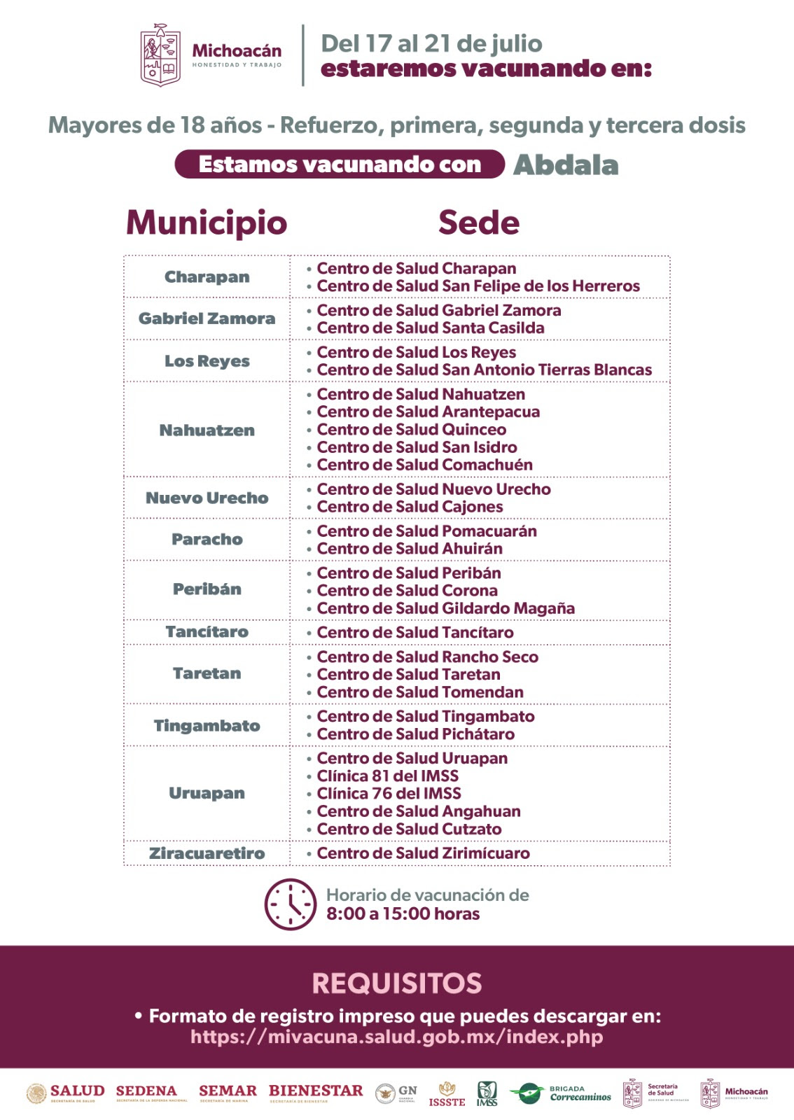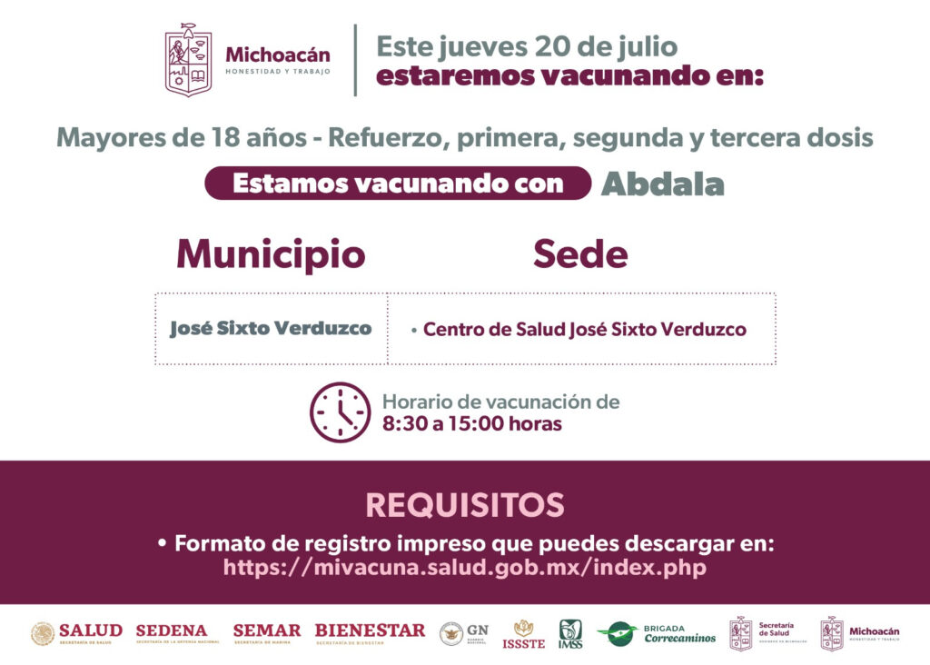 Es así, que se estarán aplicando primera, segunda y tercera dosis, así como refuerzos del biológico Abdala a población mayor de 18 años en los municipios de Charapan, Gabriel Zamora, Los Reyes, Nahuatzen, Nuevo Urecho, Paracho, Peribán, Tancítaro, Taretan, Tíngambato, Uruapan, Ziracuaretiro.