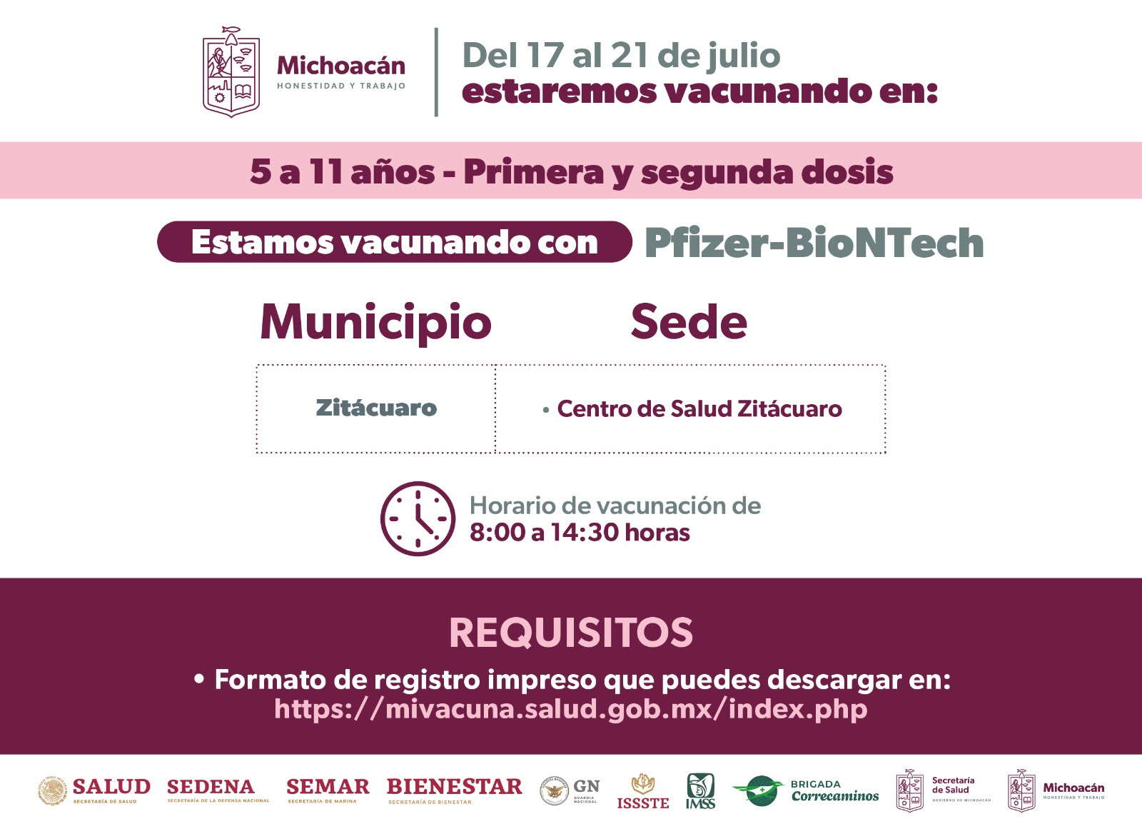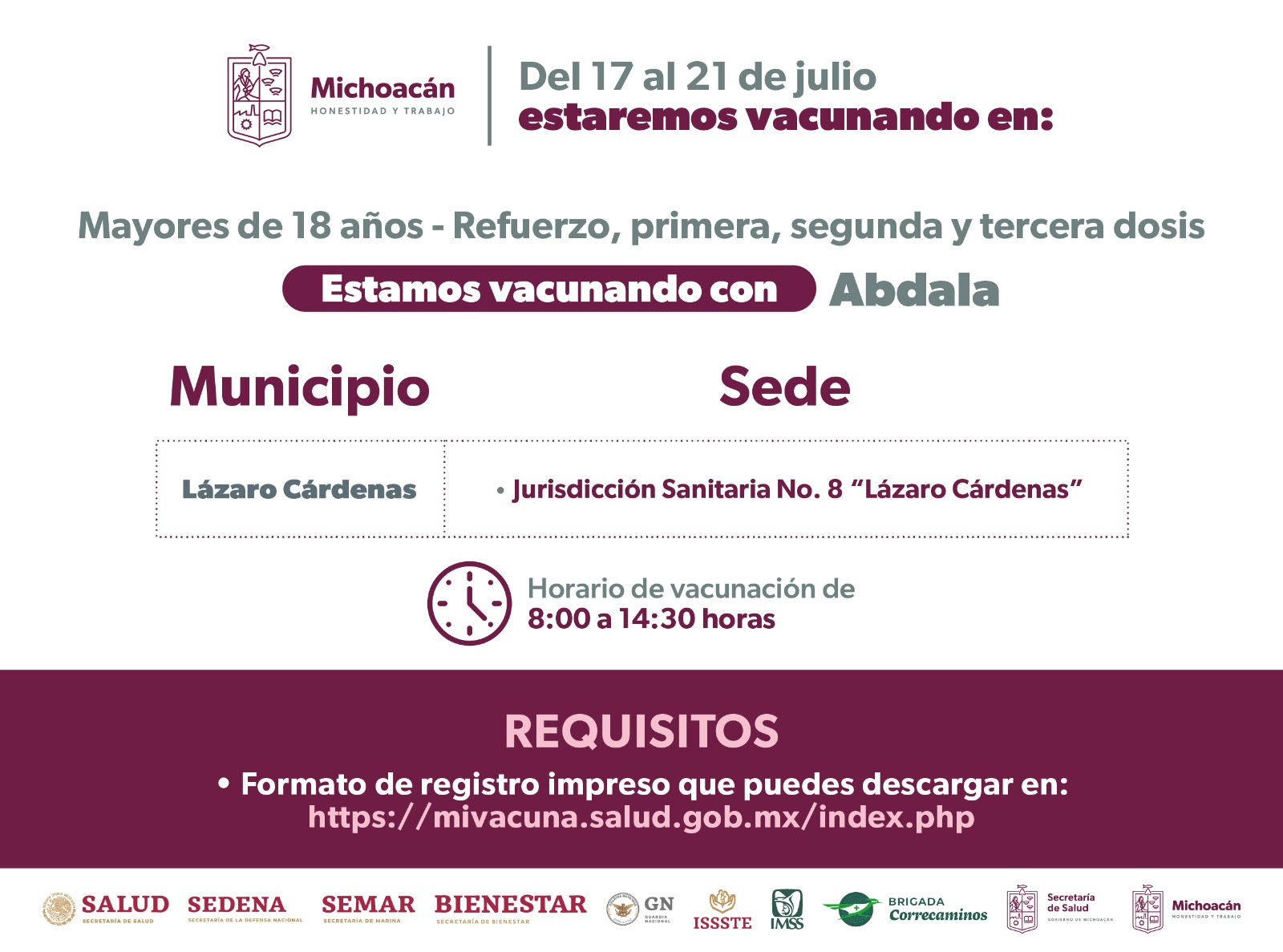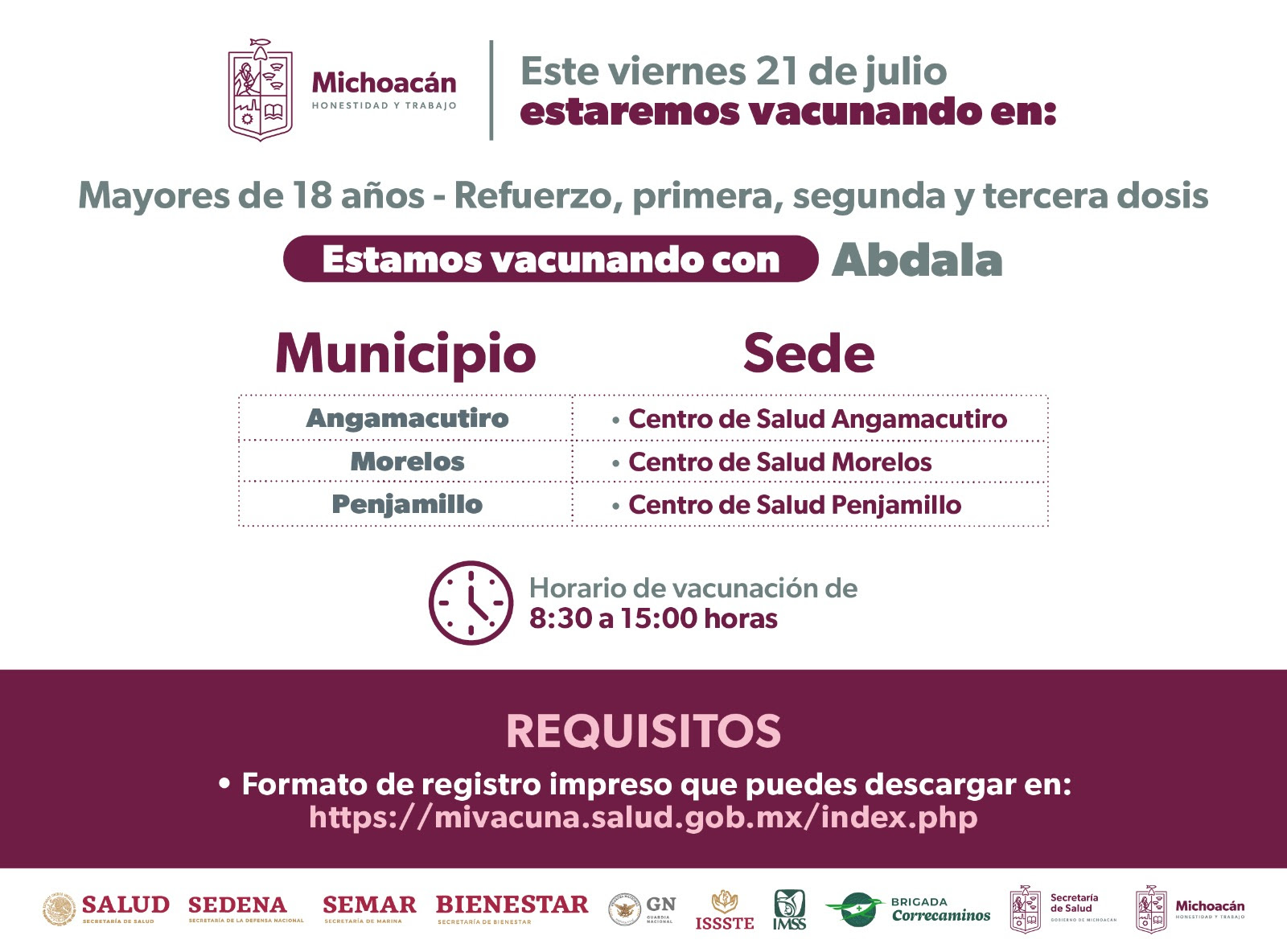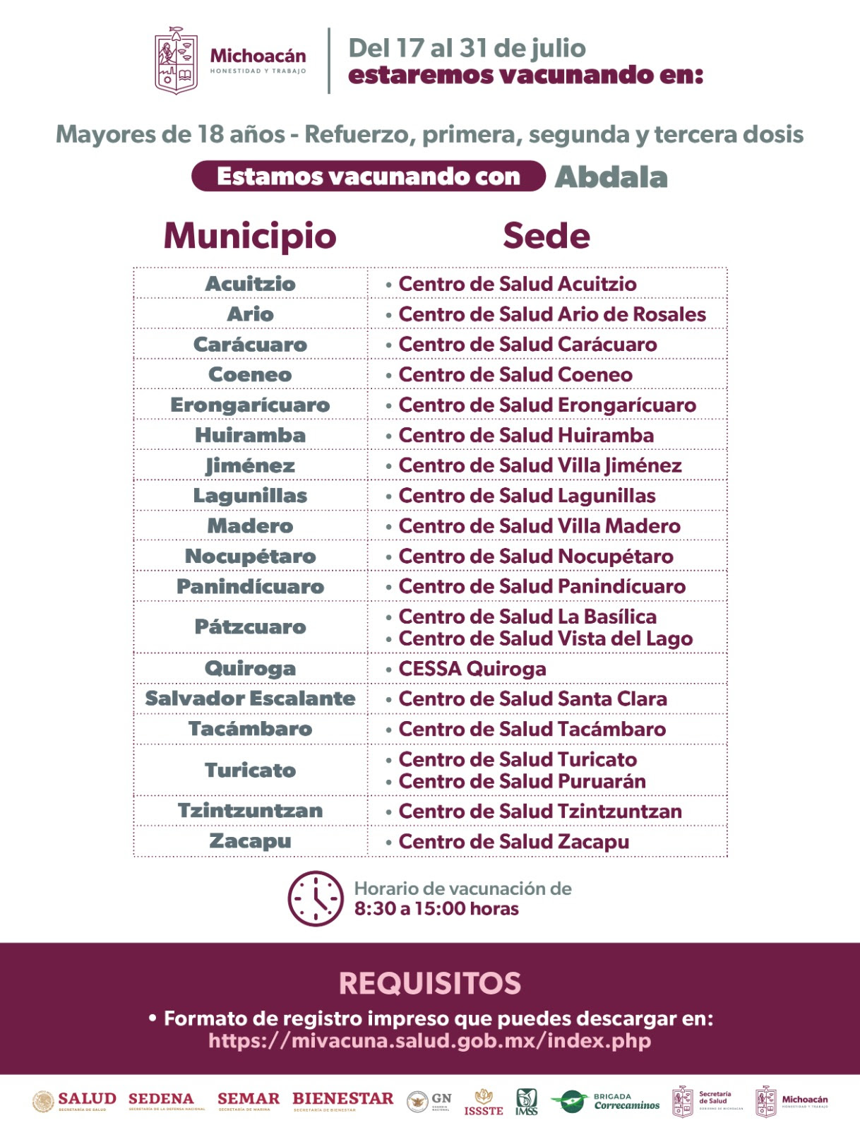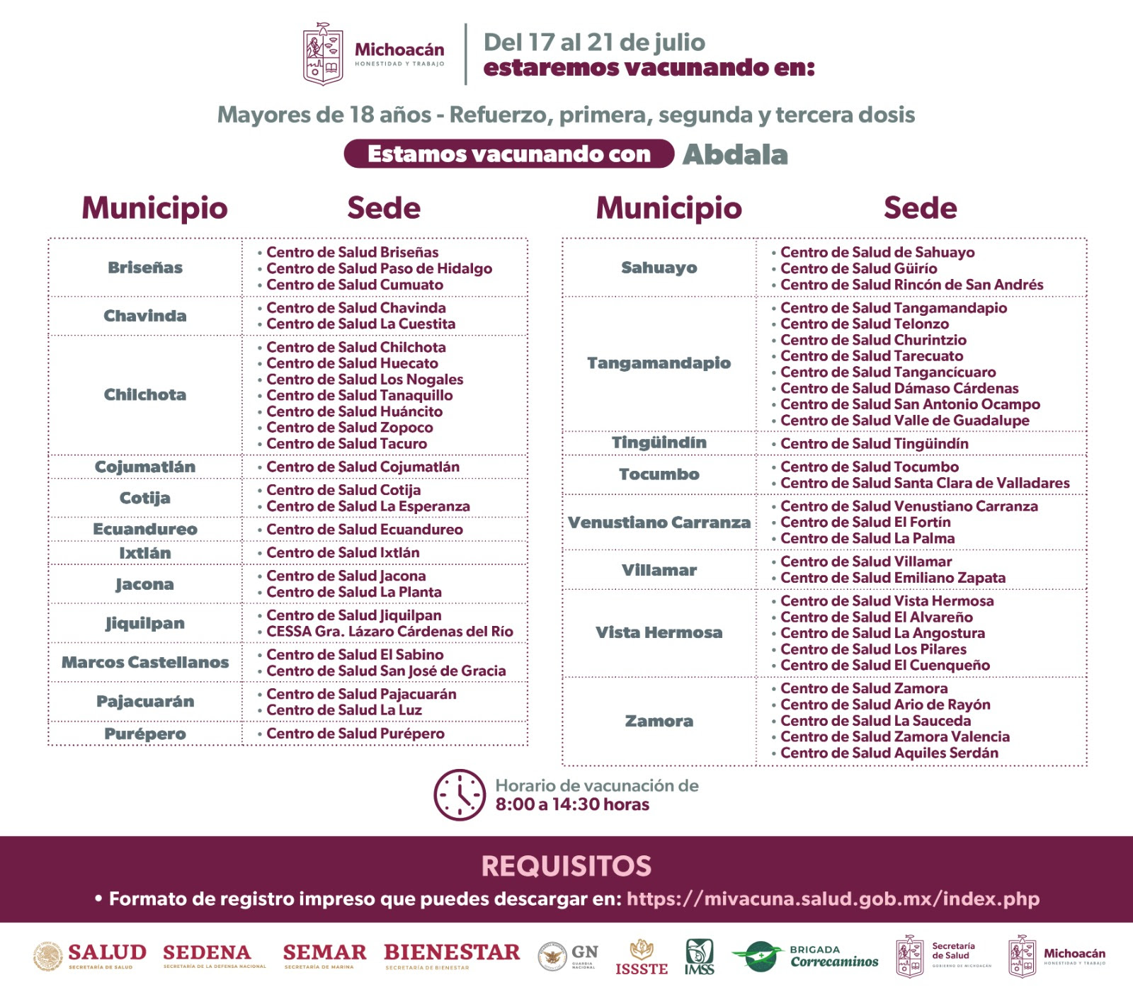 En todas las sedes los horarios de atención serán de 8:00 a 14:30 horas, y deberán presentarse con su formato de registro impreso el cual podrán descargar en la página https://mivacuna.salud.gob.mx/