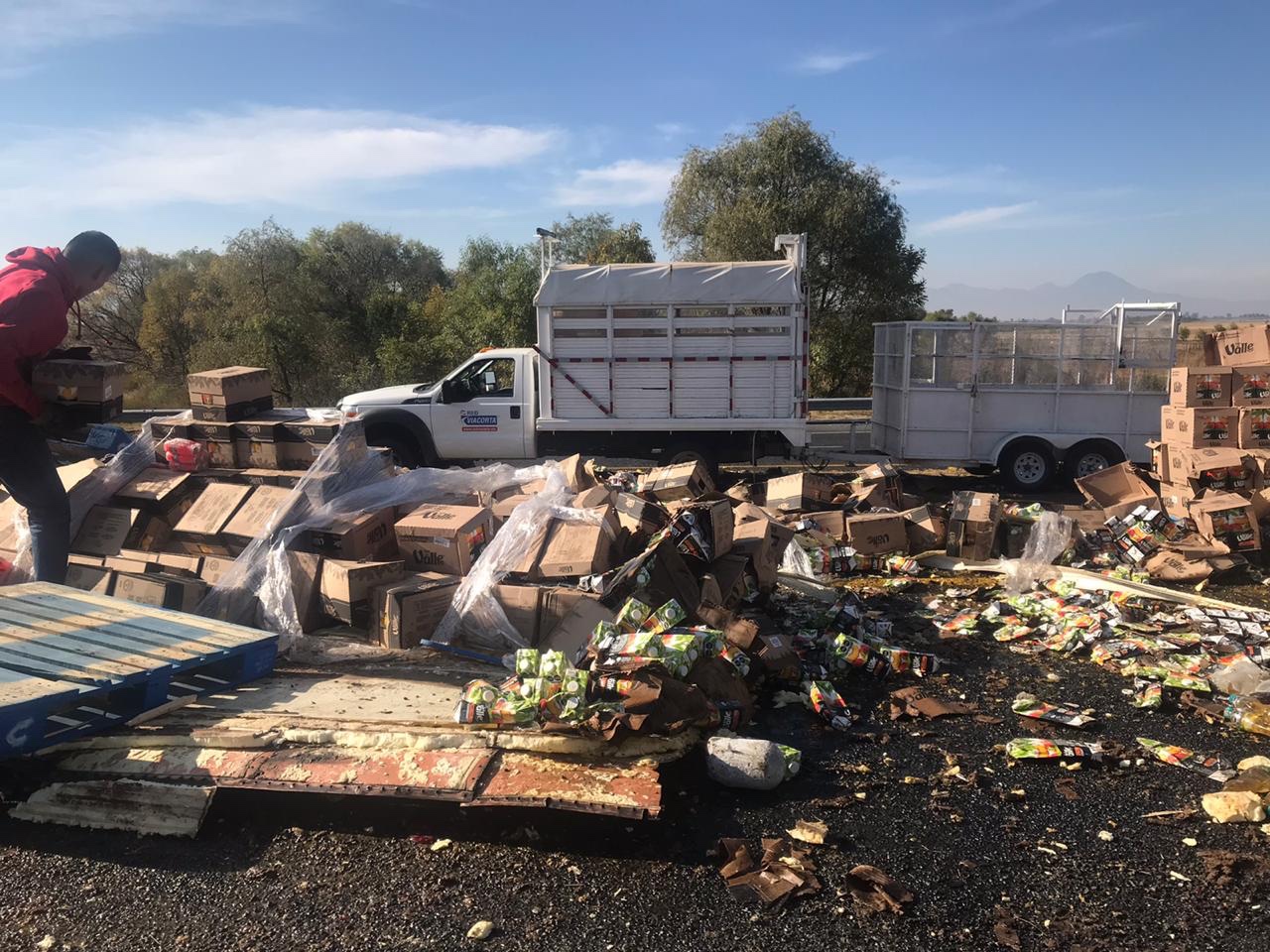 A 23 de diciembre del 2020.- La mañana de este miércoles un trailer se volcó sobre la autopista de Occidente, la unidad transportaba Jugos Del Valle, los daños materiales fueron elevados .