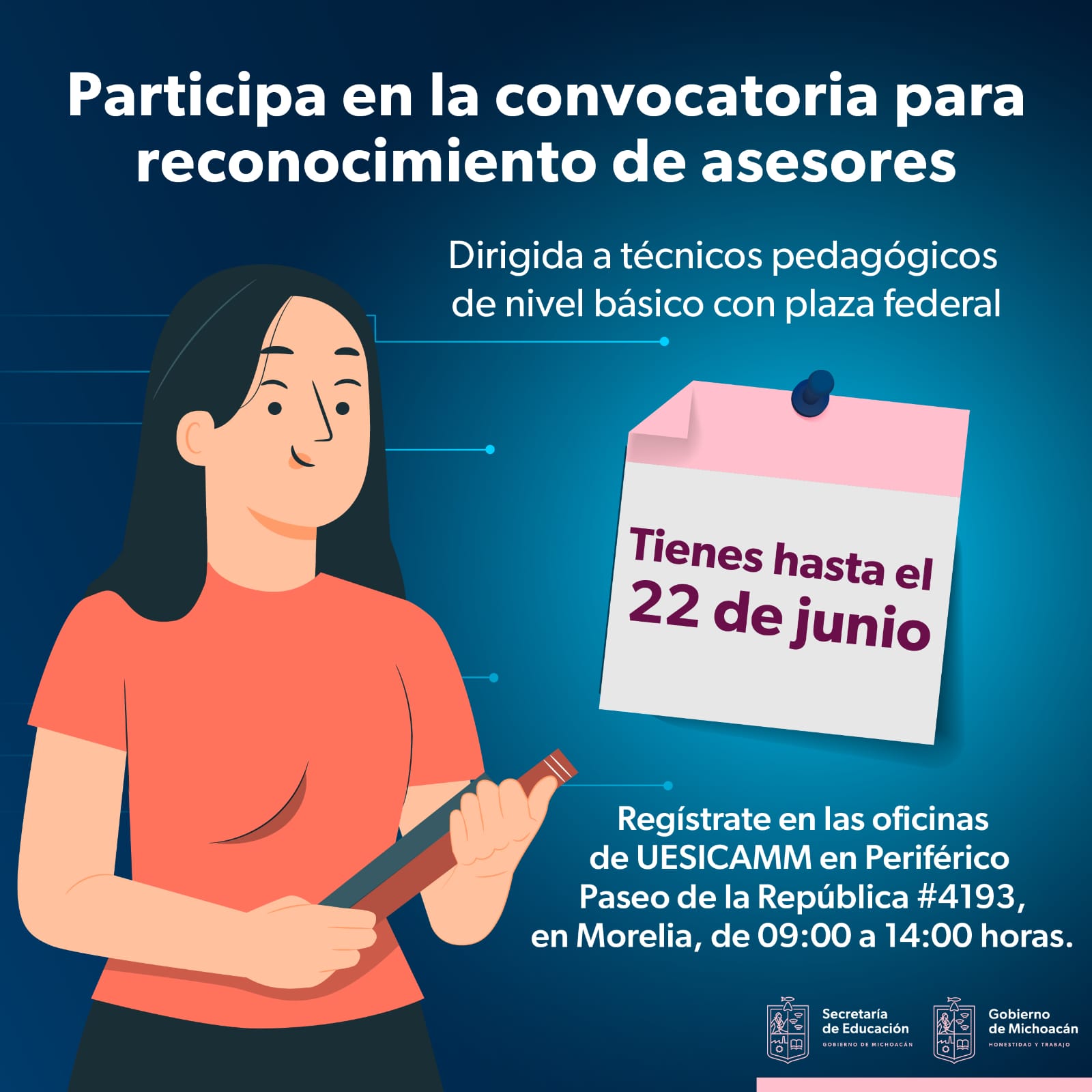 Los interesados deberán acudir a las oficinas de la Unidad Estatal del Sistema para la Carrera de las Maestras y Maestros (Uesicamm), ubicadas en Periférico Paseo de la República #4193, en la ciudad de Morelia, con un horario de 09:00 a 14:00 horas.