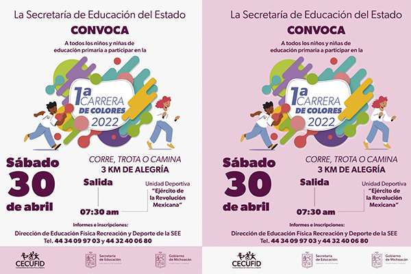 Morelia, Michoacán, 22 de abril de 2022.- La Secretaría de Educación del Estado (SEE) invita a todos los alumnos de nivel primaria a correr, trotar o caminar en la Primera Carrera de Colores.