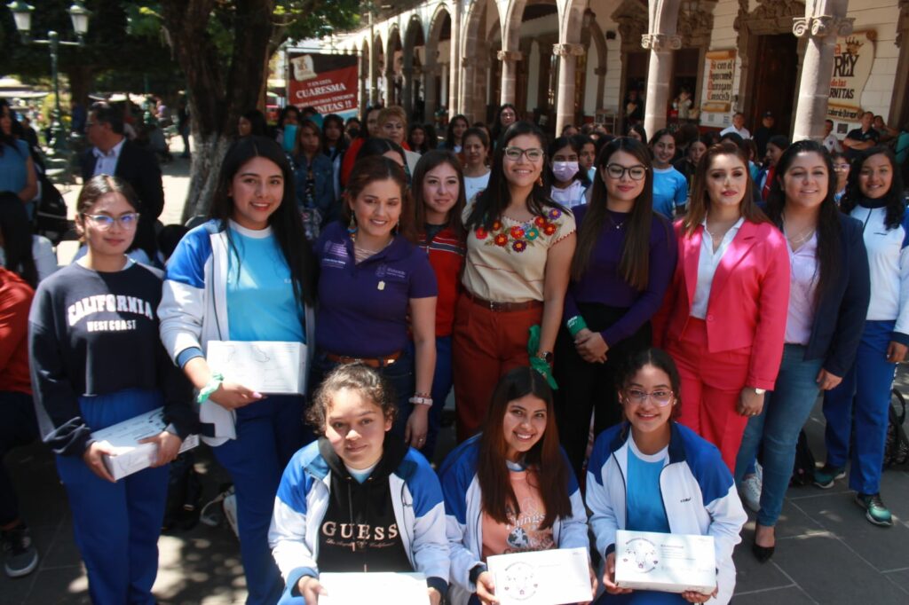 Quiroga, Michoacán, 10 de marzo de 2023.- La Secretaría de Igualdad Sustantiva y Desarrollo de las Mujeres Michoacanas (Seimujer) entregó kits de Menstruación Digna a estudiantes del Colegio de Bachilleres del Estado de Michoacán (Cobaem) en el municipio de Quiroga. La dotación de estos paquetes, que incluyen una copa menstrual, dos toallas sanitarias lavables y un calzón reutilizable, busca reducir la brecha de desigualdad y dignificar la menstruación.
