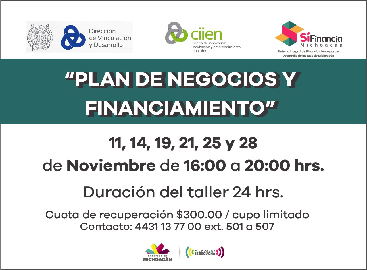 Morelia, Michoacán, 05 de noviembre de 2019.- Con el objetivo de impulsar la creación de empresas en Michoacán, el Sistema Integral de Financiamiento para el Desarrollo del Estado (Sí Financia), en coordinación con la Universidad Michoacana de San Nicolás de Hidalgo, impartirán el taller “Plan de Negocios y Financiamiento”.