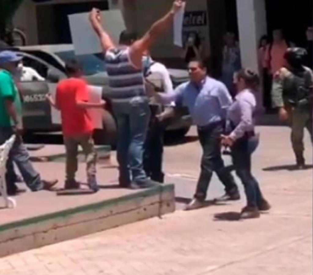 Ante dichas peticiones escritas en forma de consignas el gobernador decidió bajar de una unidad del Ejercito Mexicano en la que viajaba muy bien custodiado por personas vestidas de civiles con armas de grueso calibre, para encarar a un hombre que sostenía dos cartulinas y al mismo tiempo empujarlo.